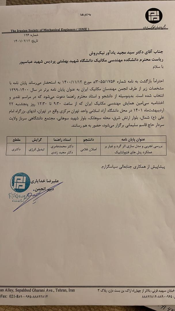 پایان‌نامه آقای دکتر اصلان غلامی دانشجوی مقطع دکتری دانشکده مهندسی مکانیک و انرژی با عنوان "بررسی تجربی و مدل‌سازی اثر گرد و غبار بر عملکرد پنل‌های فتوولتاییک" و راهنمایی آقایان دکتر محمد عامری و دکتر مجید زندی به‌عنوان پایان‌نامه برتر سال 1400-1399 از طرف انجمن مهندسان مکانیک ایران انتخاب شد.