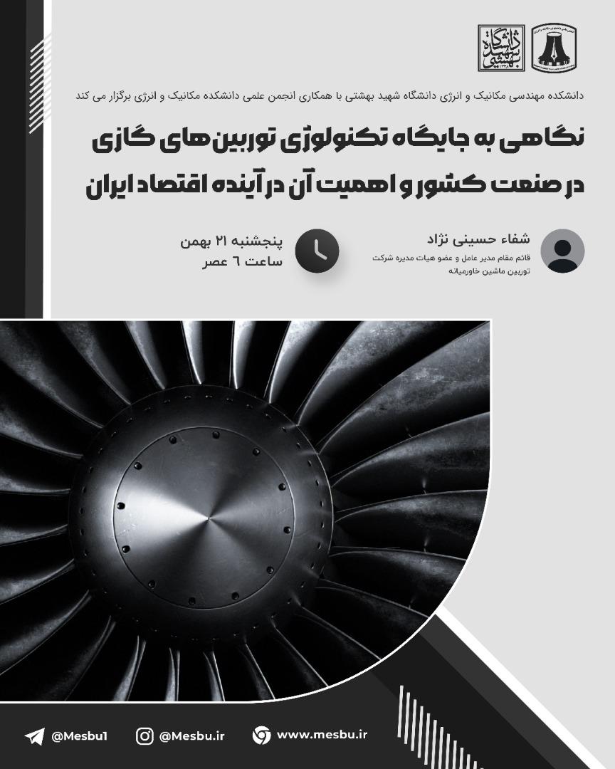 با سخنرانی جناب آقای شفاء حسنی نژاد، قائم مقام مدیر عامل و عضو هیأت مدیره شرکت توربین ماشین خاورمیانه روز پنجشنبه مورخ 21 بهمن ماه ١٤٠٠ ساعت 18 به صورت مجازی برگزار خواهد شد.