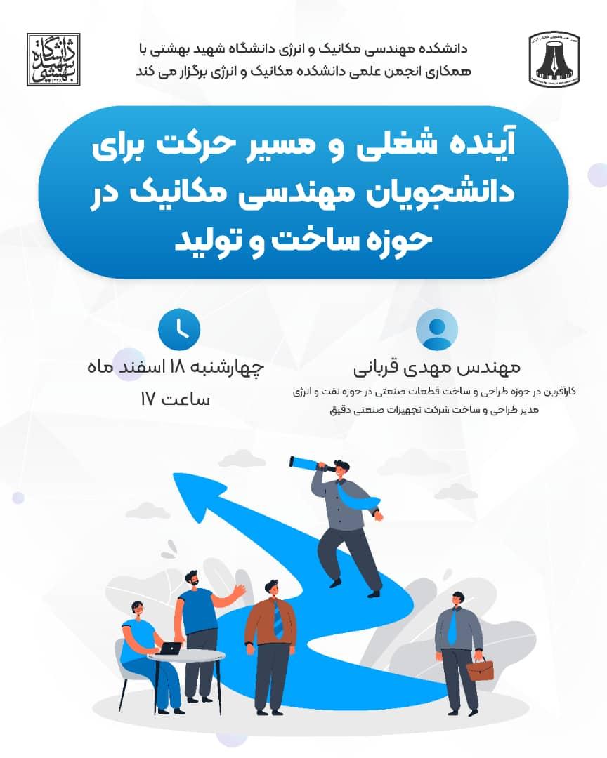 نشست تخصصی "آينده شغلی و مسير حركت برای دانشجويان مهندسی مكانيك در حوزه ساخت و توليد" با حضور جناب آقای مهندس مهدی قربانی، كارآفرين در حوزه طراحی و ساخت قطعات صنعتی نفت و انرژی و مدير طراحی و ساخت شركت تجهيزات صنعتی دقيق.